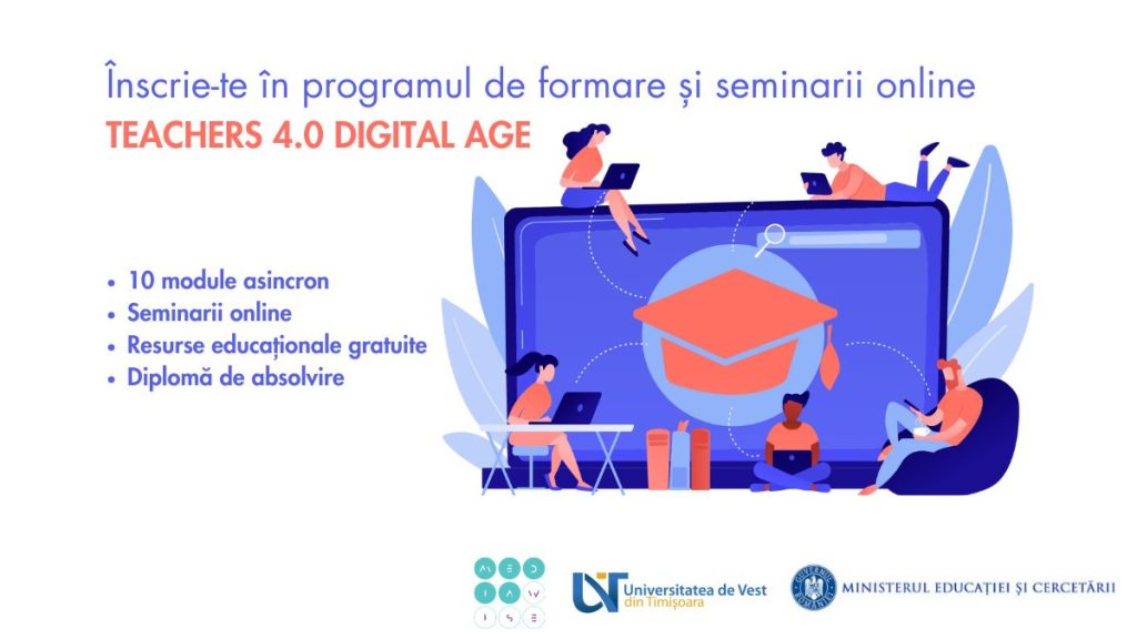 Mediawise Society, împreună cu Ministerul Educației și Cercetării și Universitatea de Vest din Timișoara, alături de partenerii săi europeni din proiectul Teachers 4.0, te invită să te înscrii în programul de formare și seminarii online Teachers 4.0 Digital Age, dedicat cadrelor didactice și altor specialiști din școală.